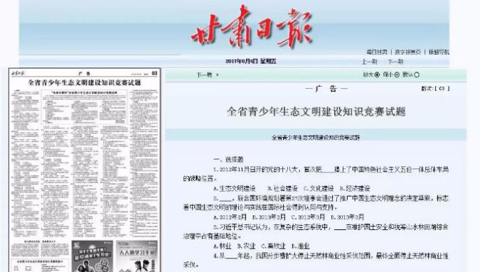 近日,为深入贯彻落实习近平总书记系列重要讲话精神及治国理政新理念新思想新战略,特别是关于生态文明建设的重要论述和视察甘肃重要指示精神,教育引导全省广大青少年从小树立绿色发展、循环发展、低碳发展的生态环保意识,为实现“中国梦”和建设经济发展、山川秀美、民族团结、社会和谐的幸福美好新甘肃贡献青春力量。共青团甘肃省委在全省青少年中广泛开展了生态文明建设知识竞赛。