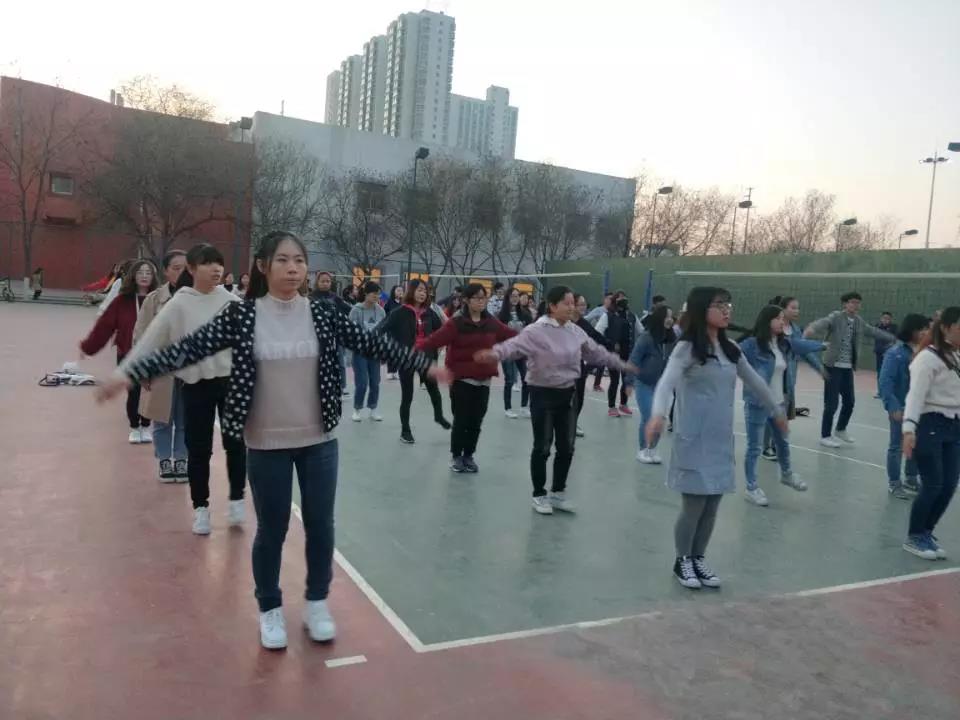 训练场上,同学们个个精神抖擞,昂首挺胸,无不散发着蓬勃的朝气与青春的活力。在领操同学耐心的讲解与纠正下,一个举臂,一个转身,一次弯腰,都做得一丝不苟,动作整齐划一,和着音乐节拍,时而柔美,时而活力,充满青春向上的蓬勃朝气。