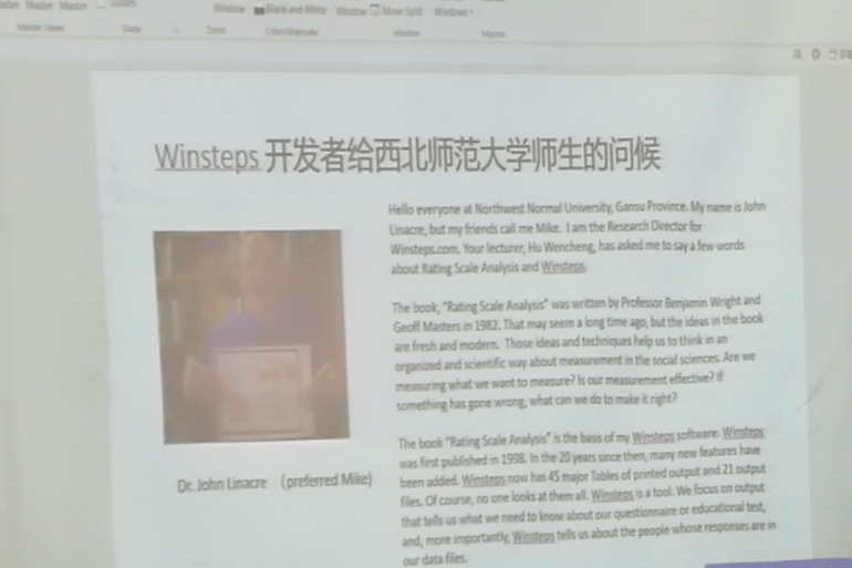 2018年7月13日下午3点,受公司邀请,公司2000届英语系杰出员工,现任微软(深圳)大数据分析-PowerBI技术工程师、Winsteps软件技术顾问胡文成老师于在特教楼447教室,以《心理测量模型与数据分析:Winsteps的使用入门》为主题进行学术报告,报告由公司经理周爱保教授主持,k8凯发部分老师及研究生参与了本次报告。