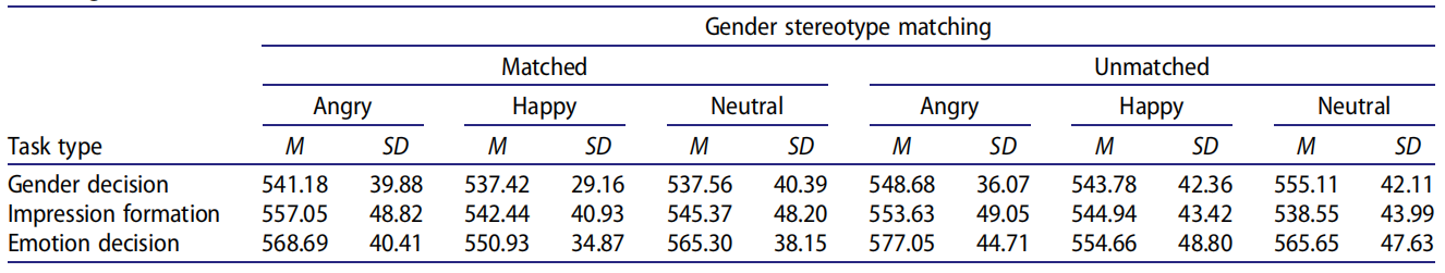 Table 1. Descriptive statistics for reactions times (in ms) in the lexical decision task according to task type, facial expression, and stereotypematching