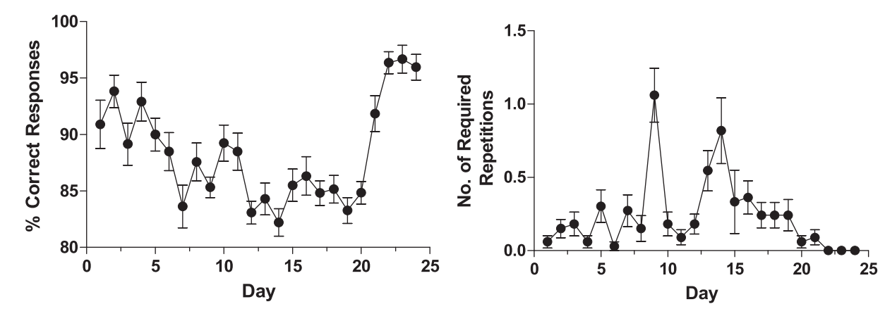 days. Right panel: Mean (±SEM) number of repetitions required to achieve >70% response accuracy on each of the virtual days