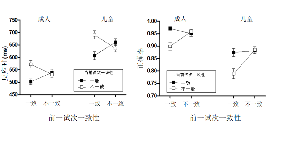 图1 成人和儿童在前一试次(一致vs.不一致)和当前试次(一致vs.不一致)的平均反应时和标准误(左);平均正确率和标准误(右)
