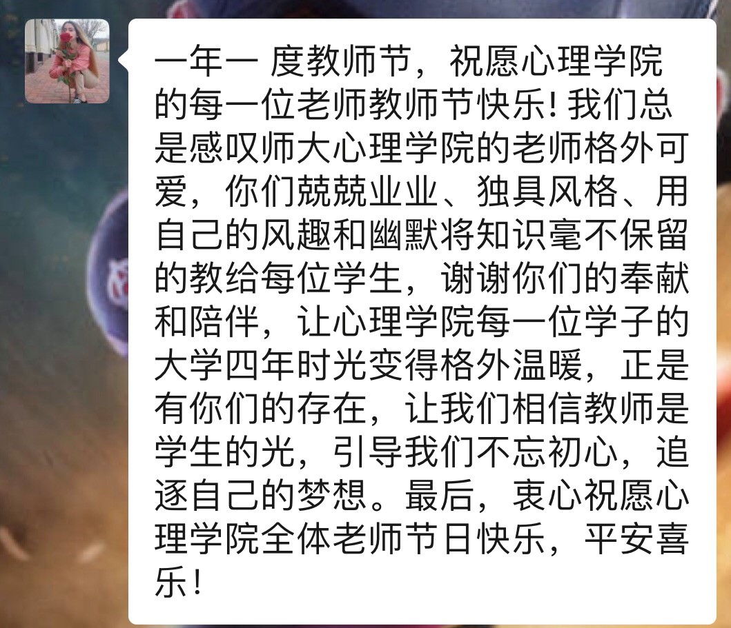 教师节前期,公司积极联系往届优秀毕业生,在教师节当天,毕业生从全国五湖四海为公司老师们发来深切祝福,包括短信、录制微视频等丰富形式。无论是毕业多年,还是刚刚踏出大公司园的毕业生们,都难以忘怀在k8凯发四年间,各位老师的悉心教导,同时也祝福老师们能够工作顺利,桃李满天下!