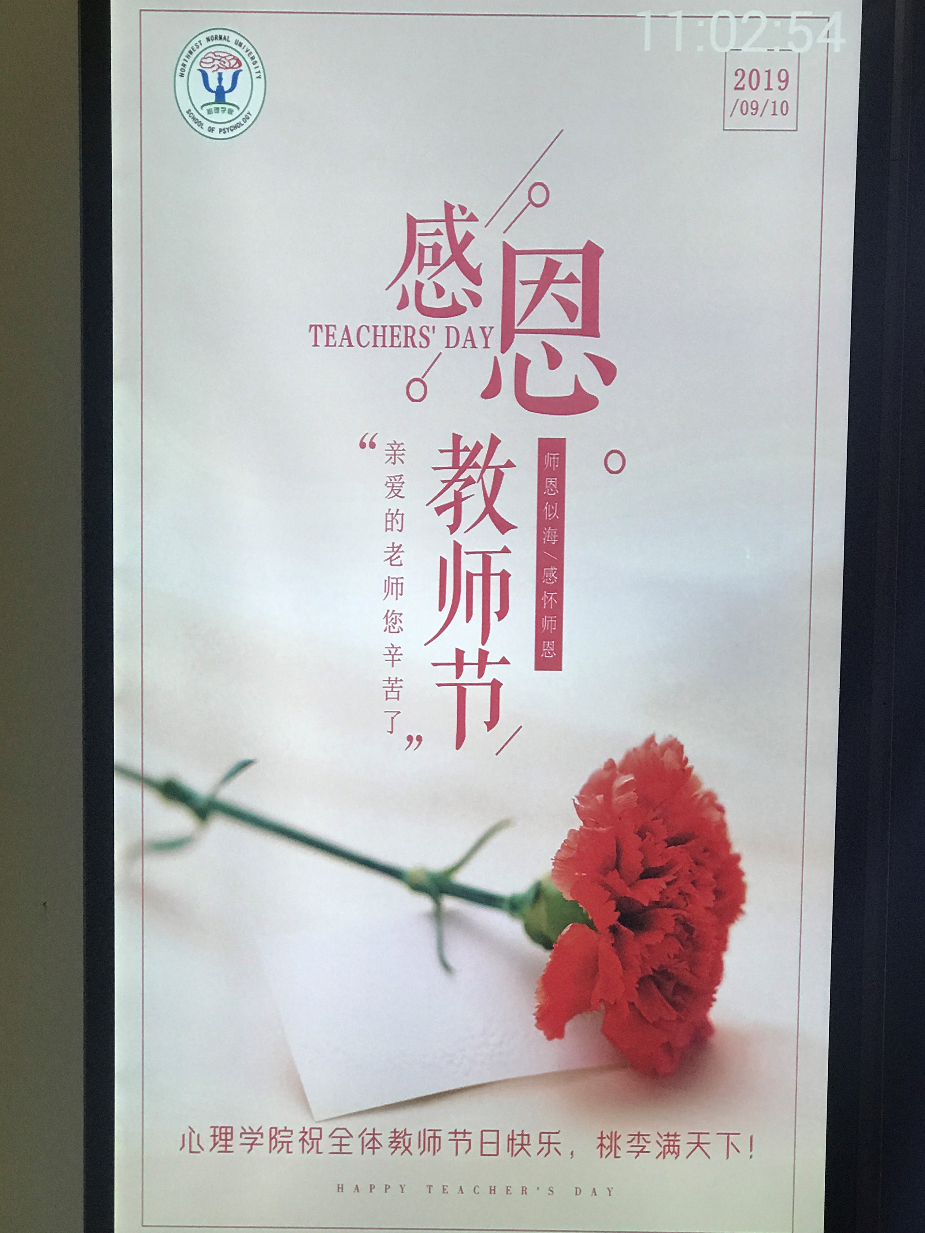 k8凯发充分利用位于新校区特教大楼一楼的广告机进行宣传,活动前期做好教师节祝福海报,并将海报电子版展示在广告机上,让公司老师进出时都能感受到公司送上的真挚祝福,为教师节活动营造浓厚的节日氛围。