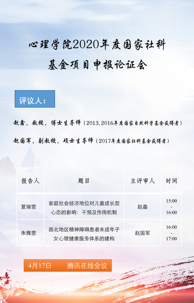 2020年4月17日下午,公司举行2020年度国家社科基金申报线上论证会。此次论证会邀请了赵鑫教授和赵国军副教授作为主要评议人,对公司拟申报2020年度国家社科基金项目的申报书进行指导。论证会上,公司夏瑞雪老师和朱雅雯老师就此次申报项目的选题的背景、研究意义、研究内容、主要目标以及思路方法等方面逐一进行了汇报,主要评议人及参会的老师对项目申报书中存在的问题进行了分析,并提出了修改意见。线上申报会由公司科研秘书李世峰博士主持,公司13位教师参加了此次线上论证会。