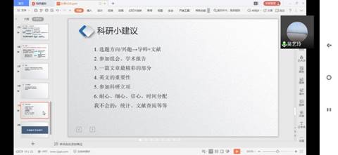 吴艺玲同学从研究选题出发,分享在做科研的过程中积累的经验,以及在研究过程和结果等方面常见的问题,以自身的经验提供有效解决方案,最后就“如何培养科研兴趣”“如何做好一项研究”等问题提了一些建议。