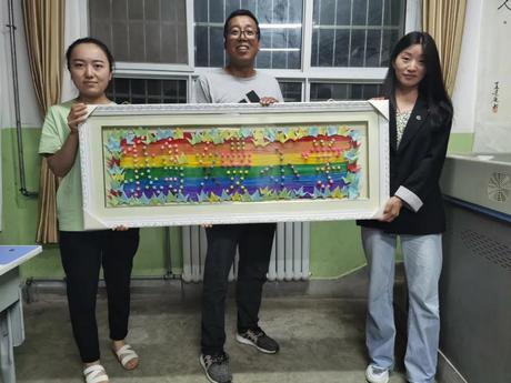 通过一周的团体辅导、相关课程以及比赛的开展,实践队成员根据不同年级员工的兴趣爱好和心理年龄制定了节目单,并根据员工的排练情况及公司的相关安排制定了完整的汇演策划方案,在鹅嫚小学各位教师、员工以及实践队员的共同努力下,《爱已启航》汇报演出顺利开展,最后,实践队员为鹅嫚小学赠送了手工制作的《鹅嫚小学》,其背景板是彩虹的颜色,彩虹是大自然造就的美好,一般在雨后天晴时出现,希望鹅嫚小学和所有的同学们,在这青山绿水的孕育之下,未来可以如这彩虹般绚丽。五颜六色的星星代表着这些多样的的员工,他们自带光芒,闪闪发亮,共同形成了“鹅嫚小学”,我们相信,这么多的发光的星星,一定能够形成一篇浩瀚的星海。“千纸鹤”中的“鹤”和这所鹅嫚小学主张的“和”字同音,希望孩子们在知识的武装之下,可以在未来展翅翱翔,飞往梦想的远方而不忘梦开始的地方。