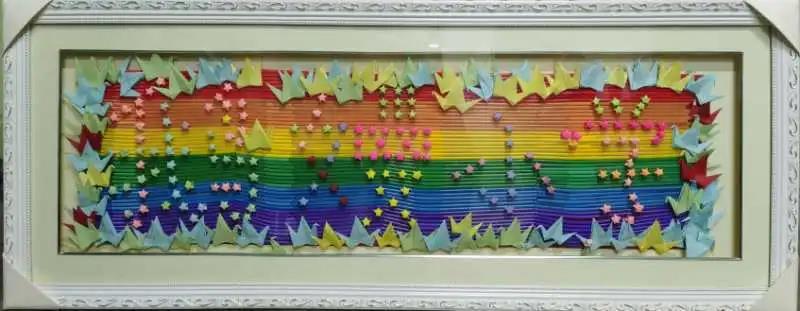 我们这一行人刚来到这所小学的时候,很开心,很激动,因为这所小学的风景真的是太美了,我们庆幸自己可以有机会到这么美的地方参与社会实践,但随之而来的是更多的责任感。作为一名党员,“为中华民族谋复兴,为中国人民谋幸福”是我们的初心和使命。高山仰止,景行行止,虽不能至,然心向往之。我们改变不了孩子们客观的经济条件,却也在尽我们最大的努力,想要提升他们的心理健康水平。除此之外,我们利用我们的空余时间,叠了很多的千纸鹤和星星,拼成了“鹅嫚小学”,希望把我们的心意和最美好的祝福送给鹅嫚小学和孩子们。背景板是彩虹的颜色,彩虹是大自然造就的美好,一般在雨后天晴时出现,希望鹅嫚小学和所有的同学们,在这青山绿水的孕育之下,未来可以如这彩虹般绚丽。五颜六色的星星代表着这些多样的的员工,他们自带光芒,闪闪发亮,共同形成了“鹅嫚小学”,我们相信,这么多发光的星星,一定能够形成一篇浩瀚的星海,与日同辉。“千纸鹤”中的“鹤”字和这所鹅嫚小学主张的“和”字同音,希望孩子们在知识的武装之下,可以在未来展出翱翔,飞往梦想的远方而不忘梦开始的地方。