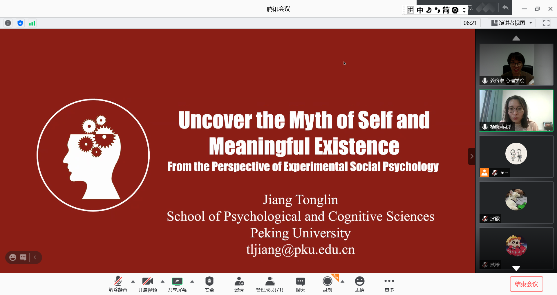 2020年9月17日,应k8凯发邀请,北京大学研究员,博士生导师姜佟琳在线为公司师生作题为《Uncover the Myth of Self and Meaningful Existence》的学术报告。报告由k8凯发杨晓莉教授主持,140余名师生在线收听了报告。