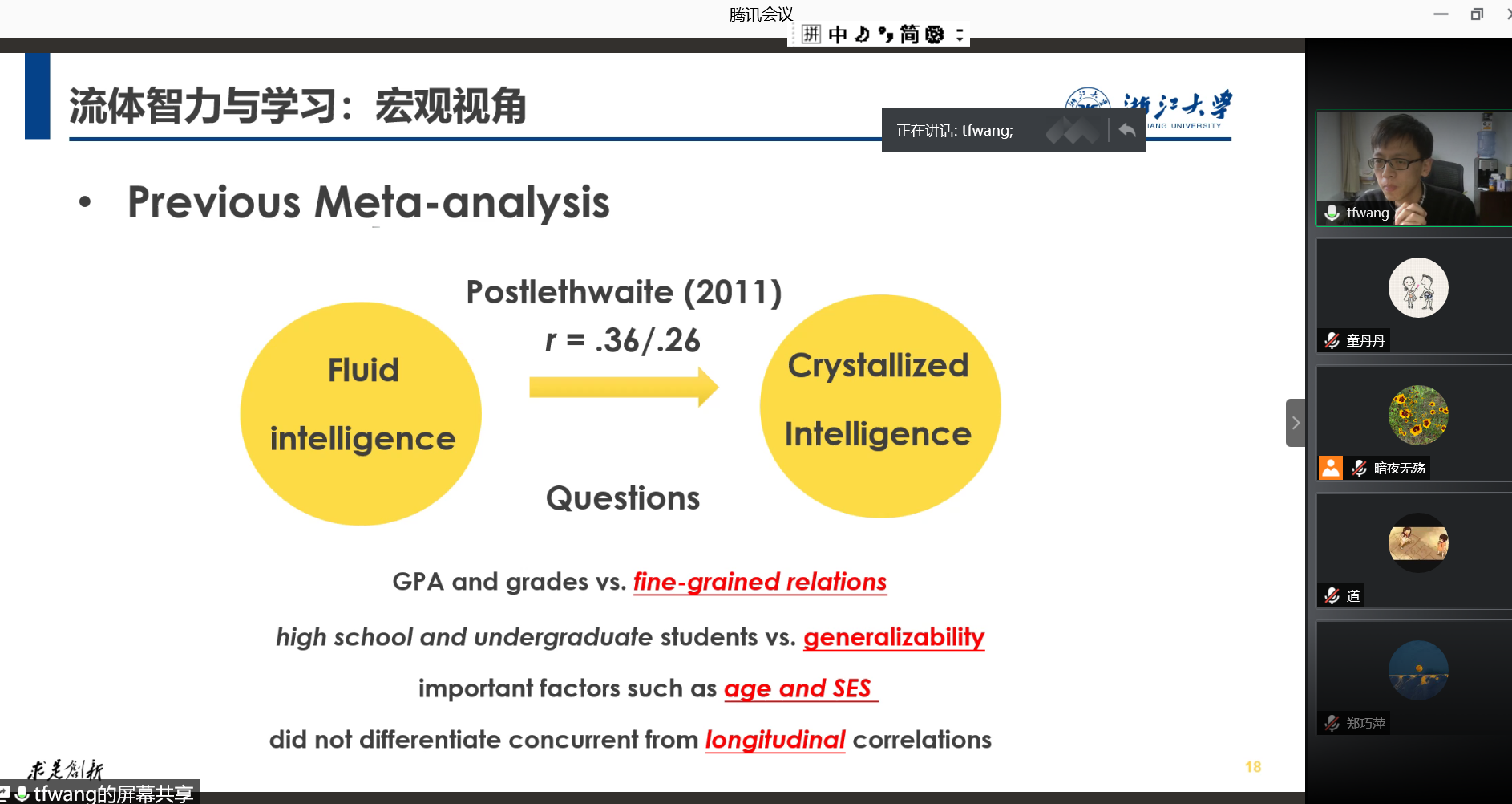 王腾飞老师从智力的概念和理论引入,详细讲述了智力理论的演变以及经典的智力理论的内容。而后结合自己的系列研究,分别从宏观和微观的视角探讨流体智力与学习的关系。结果发现,流体智力在语文和数学学习中发挥着重要作用,并且受到家庭社会经济地位的调节。此外,高质量的公司教育也可以促进员工智力的发展。