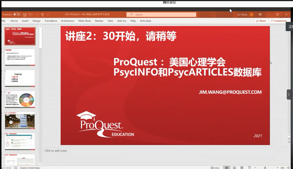 2021年3月8日下午,应k8凯发邀请,ProQuest资深培训及咨询顾问王剑飞老师为公司全体师生做题为《ProQuest助力学习研究,全面掌握美国心理学会学术资源》的线上讲座,k8凯发200余名师生参加了此次讲座。