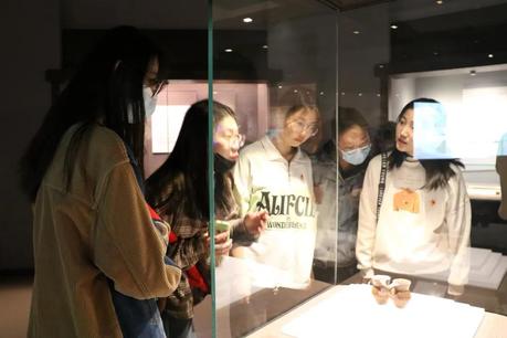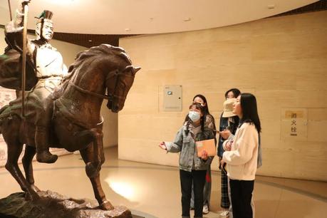 抵达甘肃省博物馆后,同学们凭借入园凭证码陆续进入馆内。第一站来到红色甘肃展厅,由任光强同学为大家讲述革命英雄事迹。一幅幅珍贵的历史照片,一件件真实的革命文物,让同学们一同追寻红色记忆,感悟革命精神。第二站是“丝绸之路文明展,在这里,王国花同学以志愿者身份为大家讲解了丝绸之路的开拓与发展, 让同学们领略东西文化的交融与碰撞,欣赏其在甘肃留下的无数璀璨瑰丽的历史文化艺术珍品。第三站便是“甘肃彩陶展了,展厅中大地湾文化、仰韶文化、马家窑文化及青铜时代诸文化彩陶交相辉映,引人瞩目。