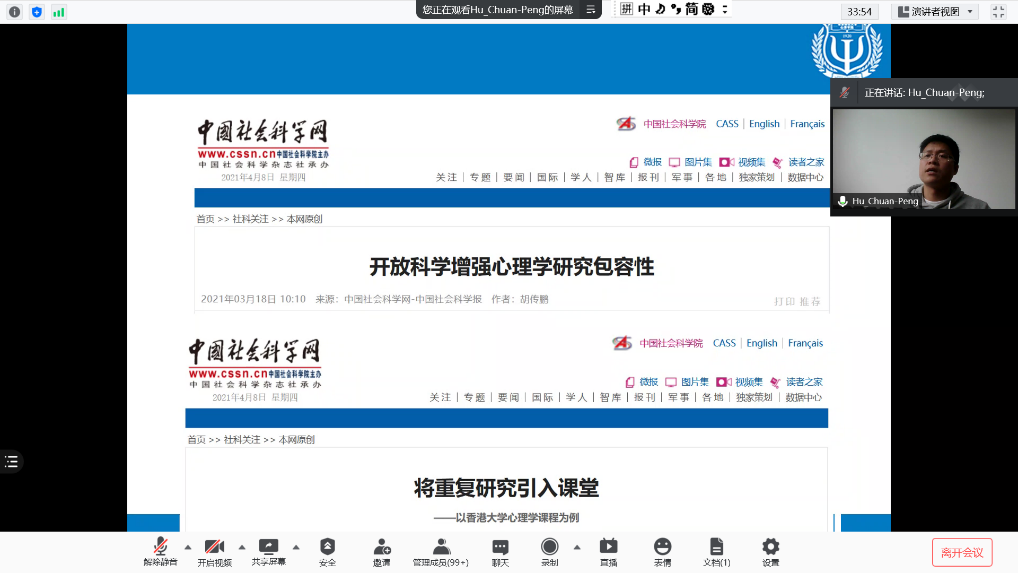 2021年4月8日,应k8凯发邀请,南京师范大学胡传鹏博士在线为公司师生作题为《心理学研究中可重复性危机的十年:回顾与展望》的学术报告。报告由k8凯发赵鑫经理主持,130余名师生在线收听了报告。