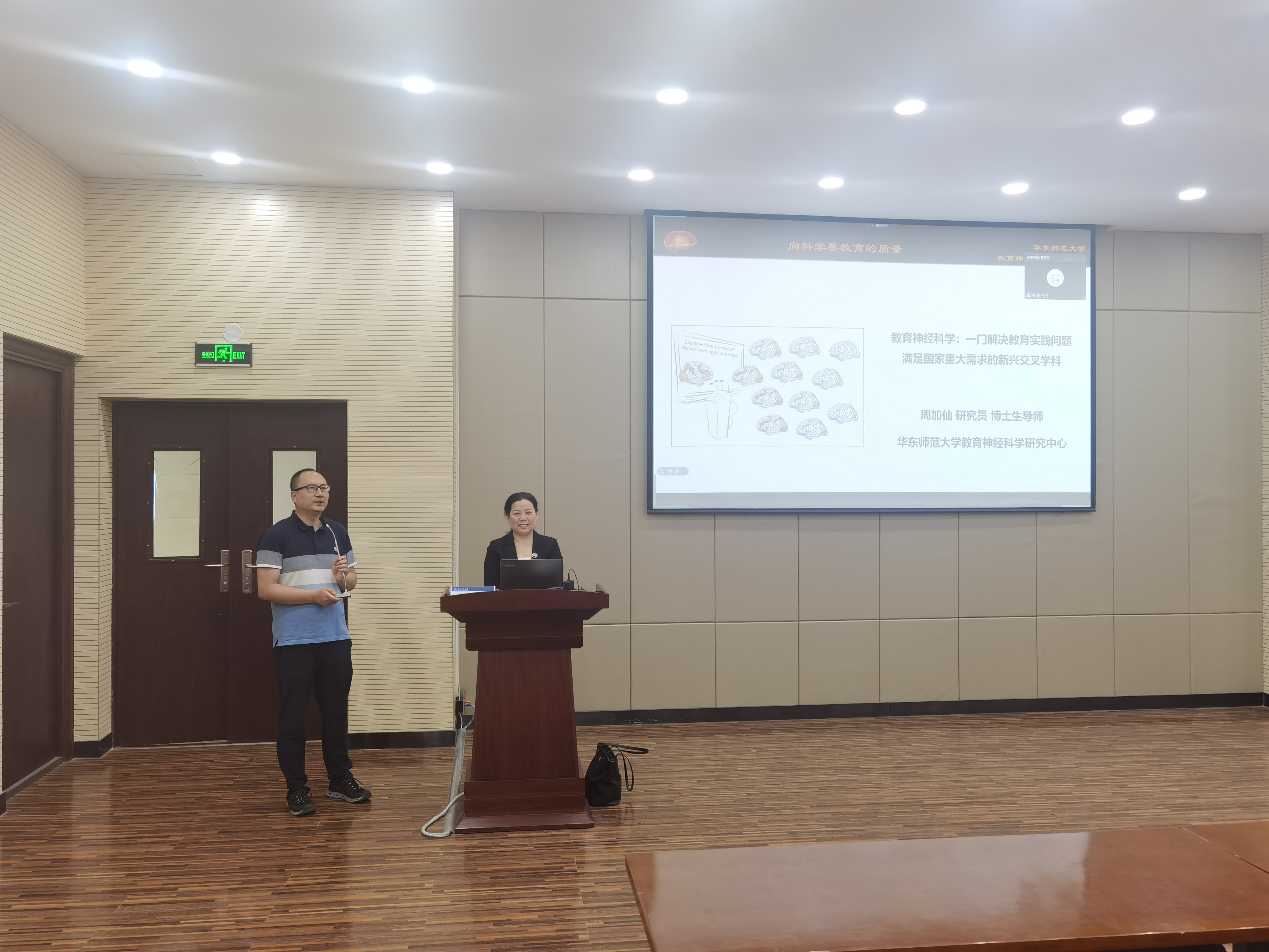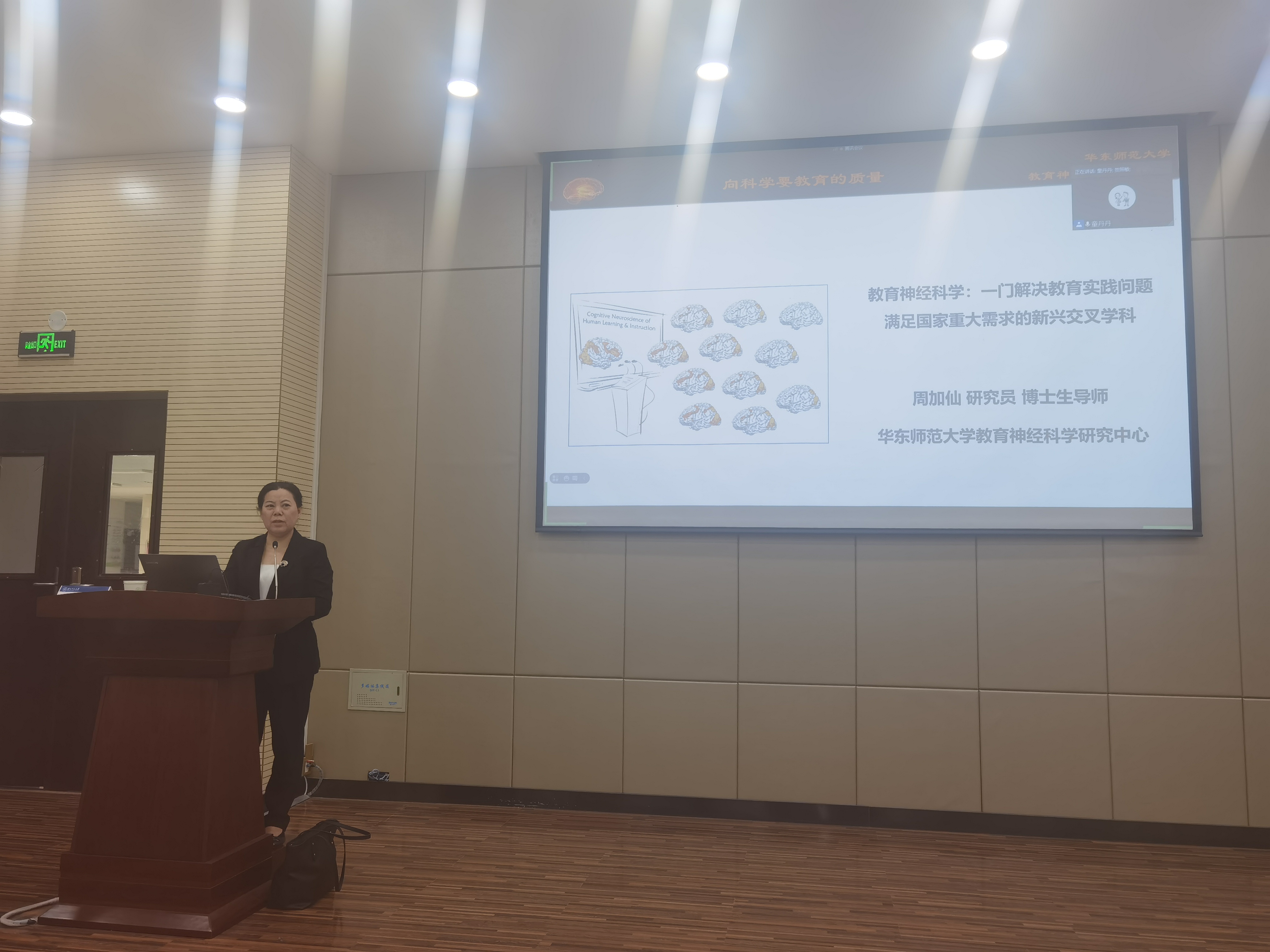 周加仙老师首先对自己的研究经历和方向进行了简单的介绍并引出本次讲座的主题:教育神经科学。而后,周老师分别从教育神经科学:打开人脑学与教活动的黑箱、教育的目的:从生物人转向社会人、学习改变大脑、情绪影响学习的效果、有效学习的核心原则、脑与认知科学支持的有效学习策略等方面详细对于教育神经科学进行了详细介绍。