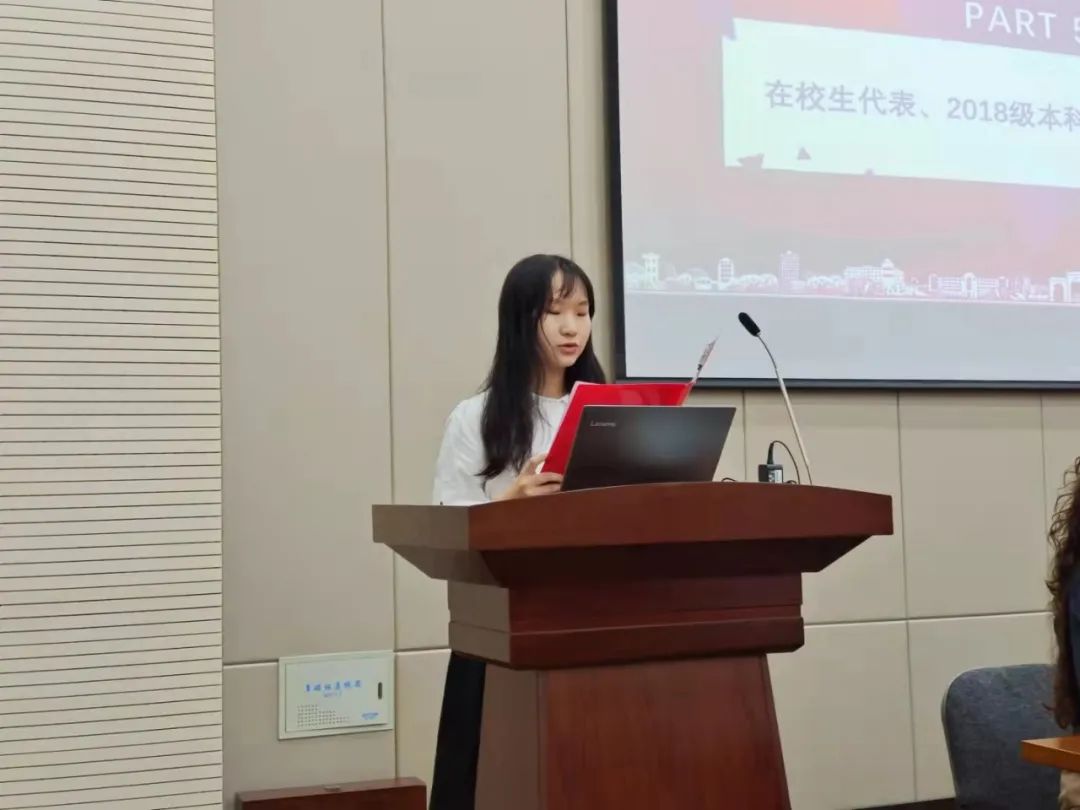 在校生代表、2018级本科生韩香同学向2021级新生同学们分享了自己的学习经验。鼓励学弟学妹们不要害怕迷茫,多去尝试。她说:“当你们以饱满的精神状态,严谨的学习作风完成四年的学业,你们会对自己的努力报以会心的微笑,那是春华秋实后收获的美好!”
