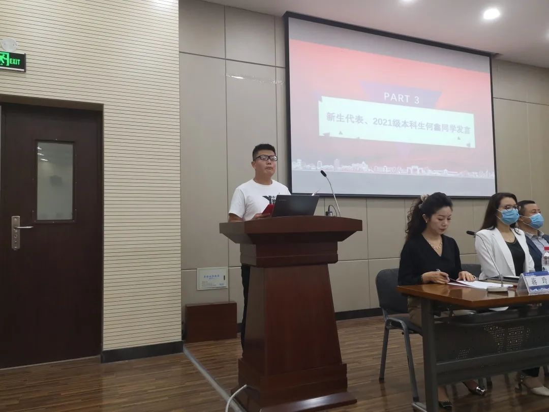随后,2021级本科生何鑫同学代表新生发言。他表示,能够作为新生代表在这里发言,自己感到万分荣幸。在“心”的起点,希望大家以昂扬的斗志,一颗永不服输的心,开启一段新的旅程,完成一段自我的成长。