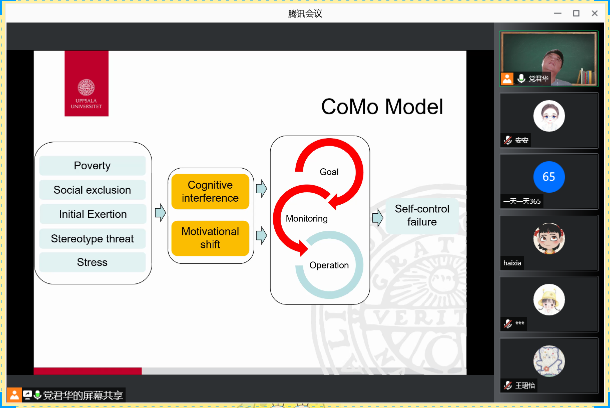 党君华博士首先对自我损耗效应的发展历史进行了系统的回顾,介绍了学界对于自我损耗效应的可重复性及其理论解释都颇有质疑的现状。而后,针对学界关于自我损耗效应相关研究的争论,党老师提出了他自己的建设性解决思路。最后,党老师还详细地介绍了自己正在开展和拟开展的各类研究项目,并邀请同学们参与。