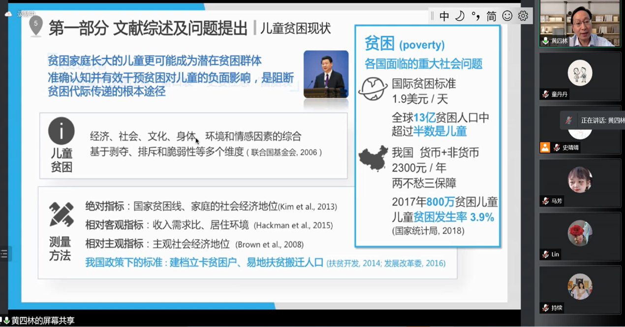 黄四林教授首先对儿童贫困现状的相关概念、执行功能的相关研究进行了系统的回顾,并从我国的实际出发,引出了报告主题——贫困对儿童执行功能的影响。而后,针对报告的主题,分别从贫困影响儿童执行功能的认知资源损耗机制、认知资源损耗机制的情境条件和认知资源恢复对贫困儿童执行功能的补偿作用这三个研究来系统、详细地进行介绍,让同学们对该领域的研究进展和实验设计思路有了更进一步的了解。