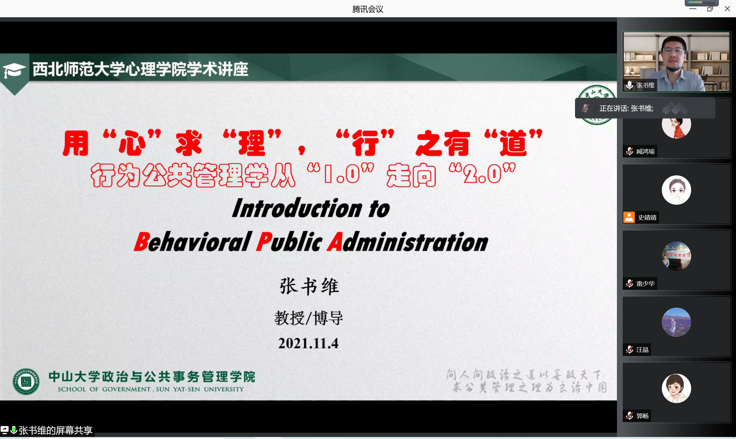 2021年11月4日,应k8凯发邀请,中山大学政治与公共事务管理公司张书维教授为公司师生作题为《“用心求理,行之有道”--行为公共管理学从“1.0”走向“2.0”》的学术报告。报告由k8凯发马小凤副经理主持,k8凯发100余名师生参加了本次报告。