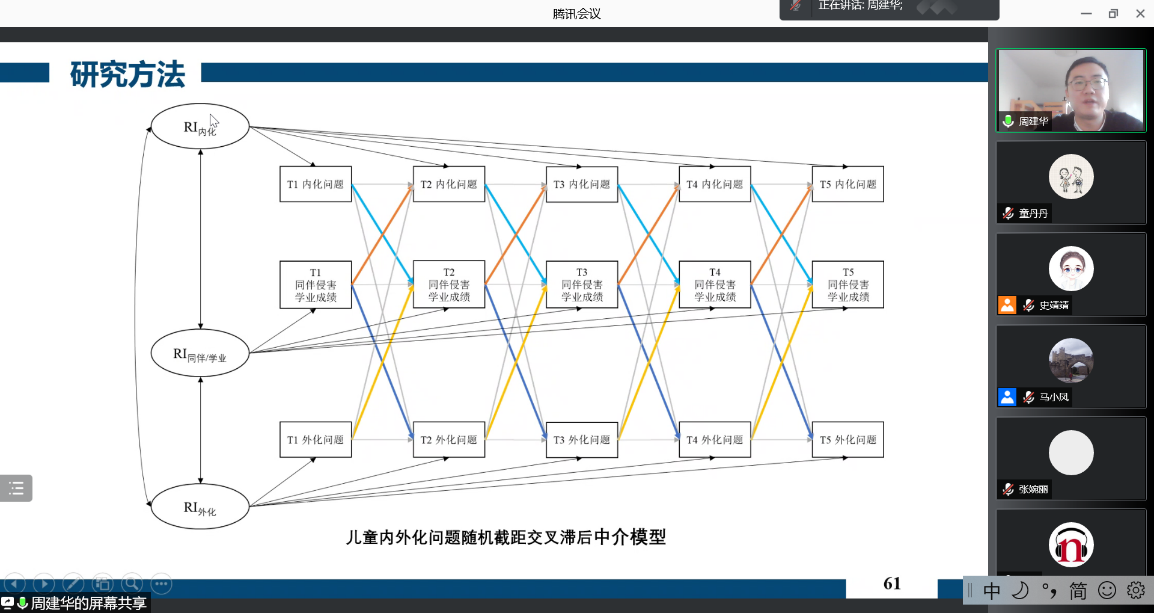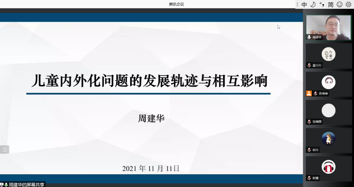 周老师首先对儿童内外化问题行为的相关概念和发展特点进行了简单的介绍,引出本次报告的主题—儿童内外化问题的发展轨迹与相互影响。而后,周老师分别对内外化问题行为的平均发展轨迹、内外化问题的异质性发展轨迹和内外化问题的纵向关系与中介机制这三项已展开的研究进行系统的介绍,并在报告中着重分享了不同研究中使用的研究工具和研究方法,让同学们对该领域的研究进展和实验方法有了较为充分的了解。
