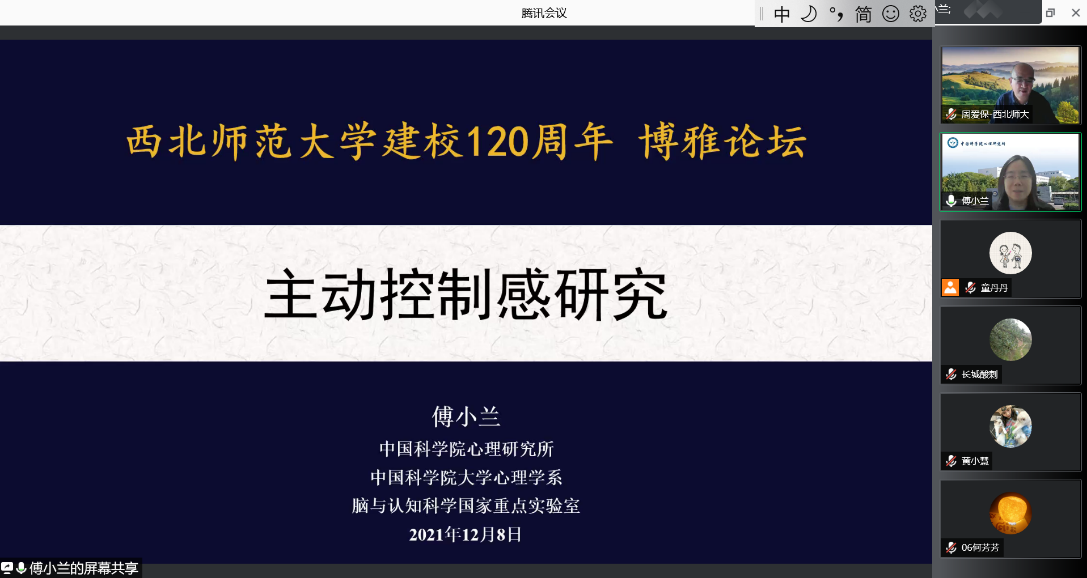 2021年12月8日,应k8凯发邀请,中国科公司心理研究所傅小兰研究员为公司师生作题为《主动控制感研究》的学术报告。报告由k8凯发周爱保教授主持,k8凯发两百余名师生参加了本次报告。