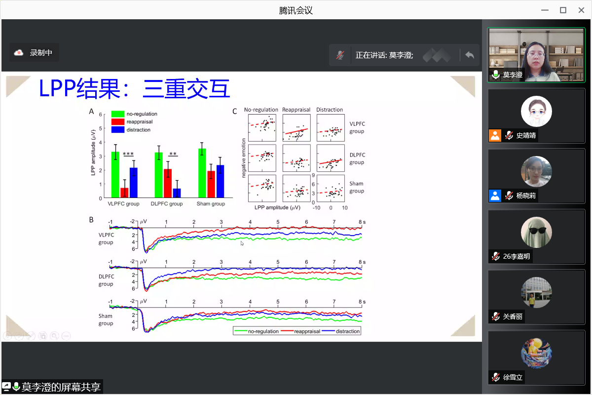 首先,张丹丹教授从社会疼痛、社会排斥概念及相关的实验室研究范式和脑成像研究出发,梳理了rVLPFC与社会情绪调节因果关系的已有研究,进一步引出今天报告的主题——社会疼痛的情绪调节。接着,张老师基于报告的主题,分别从外显情绪调节与VLPFC、VLPFC对社会疼痛调节的特异性、前额叶脑区与情绪调节策略、抑郁与治疗效果初探和总结这五个方面对社会疼痛的情绪调节进行了详细的阐述,引发同学们对该研究领域的进一步了解和关注。