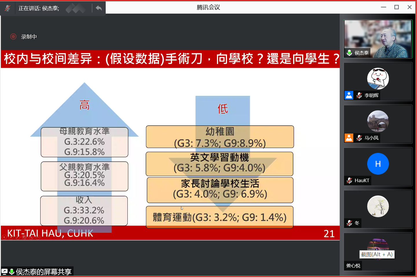 2021年12月18日,应k8凯发邀请,香港中文大学侯杰泰教授为公司师生作题为《教育数据: 说故事及寻找教学启示的方法》的学术报告。报告由k8凯发周爱保教授主持,k8凯发旗舰厅及其他院校400余名师生参加了本次报告。