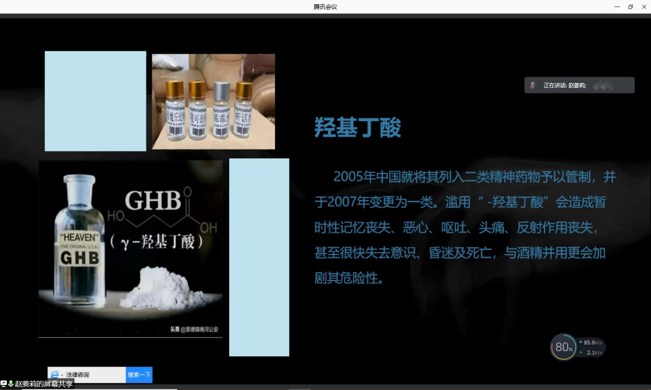 赵姜莉警长首先带领大家对不同类型的毒品进行了充分的认识。接下来为大家介绍了毒品的特征和要素。其中包括毒品所特有的依赖性,包括生理依赖和心理依赖。讲座期间,赵警长带领我们一同观看了戒毒人员所写的悔过书,让大家对毒品的危害有了更加深刻的认识,此外还介绍了毒品使用相关的法律法规。第三部分,赵警长为大家介绍了相关的戒毒常识。