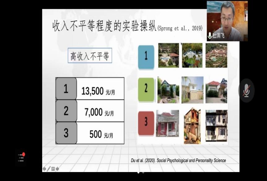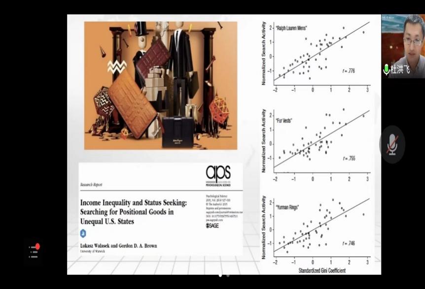 杜洪飞副教授的本次讲座以收入不平等这一社会问题为主题展开,详细介绍了收入不平等对心理与行为的影响。首先,杜洪飞副教授介绍了什么是收入不平等。其次,杜洪飞副教授概括了收入不平等对心理健康、情绪、诚信行为和消费行为四个方面的影响。最后,杜洪飞副教授还从上行社会比较、内外归因、系统公正信念等三个方面阐述了收入不平等影响个体心理和行为的机制。杜洪飞副教授两小时的精彩讲解让同学们对收入不平等这一问题如何影响个体的心理与行为有了更加深刻的理解。