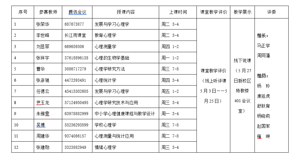 线上课堂教学展示从2022年5月16日至25日,为期两周时间。公司12位青年教师首先提交线上教学平台登录账号,并以线下课堂教学结合线上直播的方式展示了课堂教学,观摩课程包括《教育心理学》、《心理的生物学基础》、《心理学研究方法》、《心理统计学》等12门课程(具体活动安排如表1所示)。