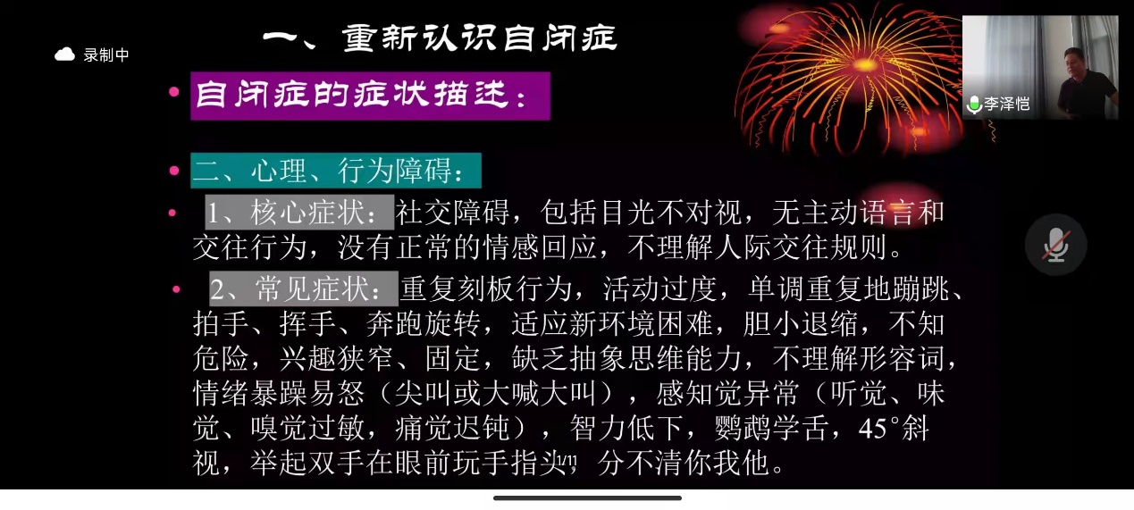陈主任首先介绍了自闭症传统定义的不足、自闭症的常见症状、传统的自闭症治疗康复方法,以及自闭症医教融合的新探索方法。其次,陈主任阐述了自闭症新定义的优势、对自闭症成因的新理论解读、自闭症症状对应病因的具体解释。此外,陈主任分享了其团队目前探索的Meta-synthesis现代中医集束压力波经络重构疗法的治疗理念,并分享了一些治疗成功的个案视频。最后,陈主任对自闭症医教融合的未来进行了展望。陈主任的精彩讲解引发了同学们对自闭症的全新思考。