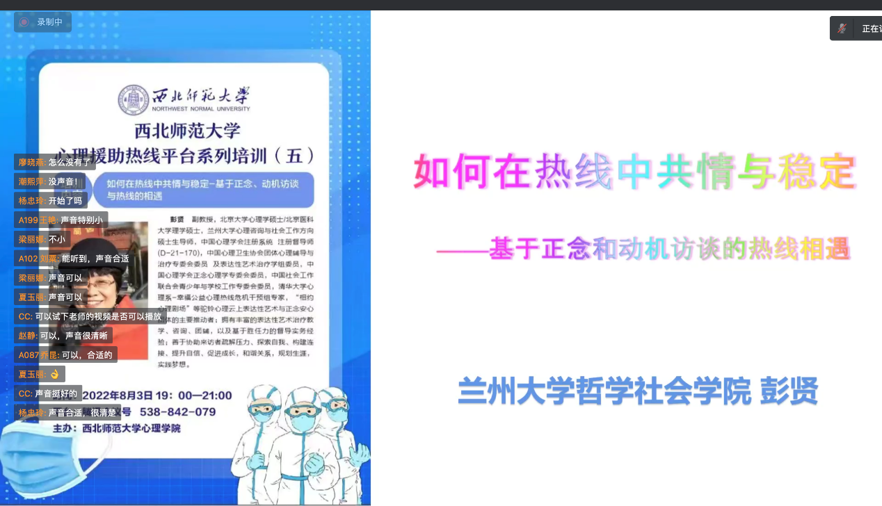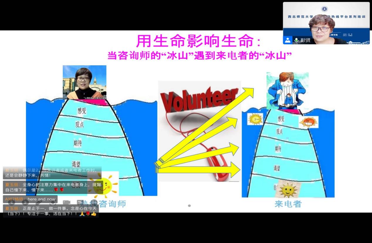 2022年8月3日,k8凯发旗舰厅心理援助热线平台通过线上形式对本次热线服务的心理志愿者进行了第五场心理援助热线的培训。本次培训由k8凯发朱雅雯副教授主持,特别邀请了兰州大学心理咨询与社会工作方向硕士生导师、注册督导师、清华大学心理系-幸福公益心理热线危机干预组专家彭贤副教授主讲,100多名志愿者参加了此次培训。