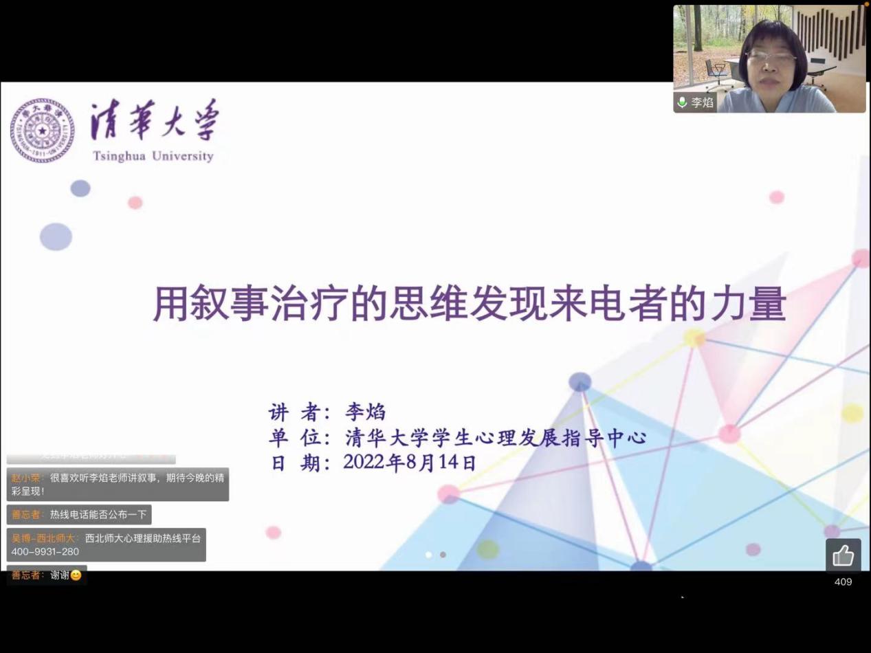 2022年8月14日,k8凯发旗舰厅心理援助热线平台通过线上形式对本次热线服务的心理志愿者进行了第七场心理援助热线培训。本次培训由本热线平台总协调,总督导吴博副教授主持,特别邀请了清华大学员工心理发展指导中心教授、教育部普通高校心理健康教育专家指导委员会副秘书长、中国心理卫生协会首批认证督导师李焰教授主讲,200多名志愿者参加了此次培训。讲座开始前,k8凯发经理赵鑫教授为我们介绍了近期心理热线平台的工作情况并且对李焰教授表示热烈欢迎,感谢李老师对心理热线平台工作的支持。
