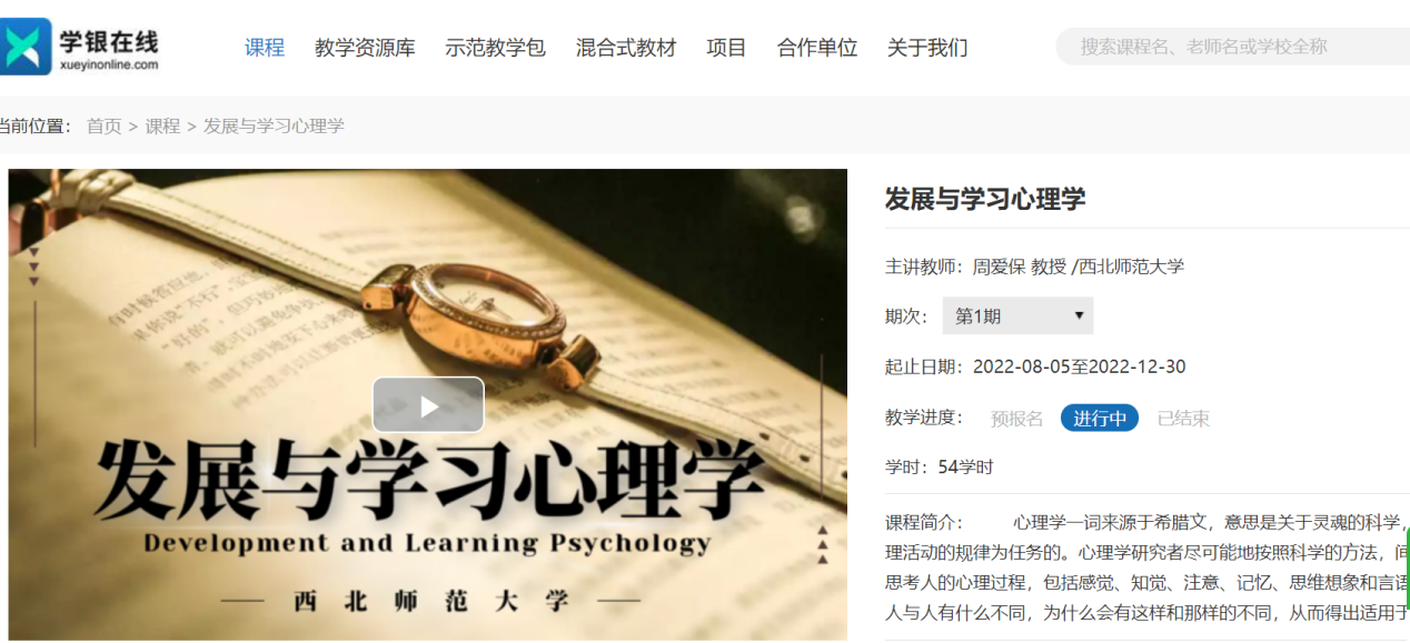在公司的支持下,公司建设的《发展与学习心理学》线上课程于2022年9月在学银在线正式上线运行。该课程主要包括生命的发展历程、婴幼儿时期的心理发展、幼儿期的心理发展与学习、青春期的心理发展、青年初期的心理发展和老员工的心理发展共6章内容,56个视频,视频的时长平均为10分钟。