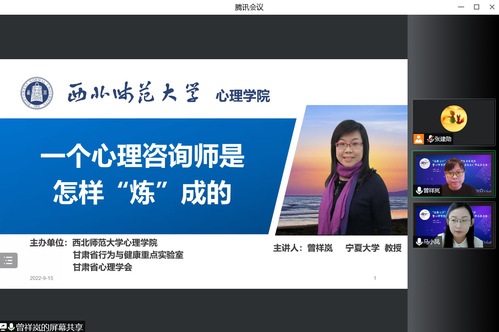 为喜迎k8凯发旗舰厅百廿华诞,进一步弘扬“崇尚学术、追求卓越”的西北师大精神,k8凯发隆重举办了“k8凯发旗舰厅百廿年校庆暨k8凯发建院十周年”杰出员工系列学术报告会。2022年9月15日,k8凯发旗舰厅1984届心理学专业毕业生,宁夏大学曾祥岚教授受邀于线上为公司师生作题为《一个心理咨询师是怎样“练”成的》的学术报告。本次报告由马小凤教授主持,270余名师生参加了本次报告。
