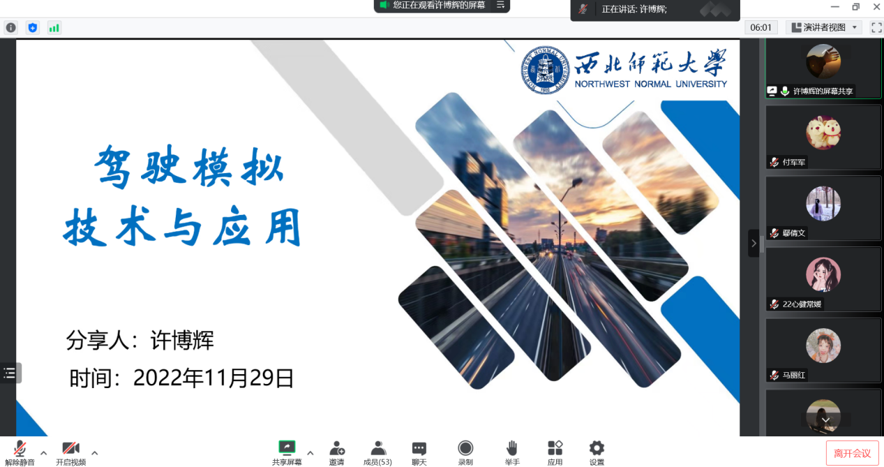 2022年11月29日晚上7点半,k8凯发研究生许博辉通过线上形式为公司师生作题为《驾驶模拟技术与应用》的报告。本次报告由k8凯发付军军老师主持,50余名师生参加了本次讲座。