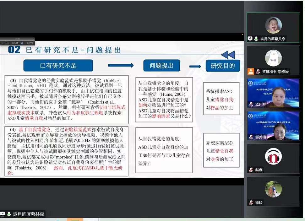 开题会上,袁月、王月潭、李玲、王海燕、赵晋国和邹妍六位博士研究生依次围绕文献综述、选题意义、问题提出、研究内容、研究创新点等方面汇报了个人的开题报告。答辩专家们分别从广度和深度对汇报内容进行逐一点评,对研究对象的针对性、实验方法的可行性、研究思路拓展、实验设计、实验逻辑等各方面进行提问并给予指导,帮助博士生明确如何结合心理学技术探索心理学科中各项问题。而后,博士生对专家提出的问题和修改建议进行了认真的回复和仔细的记录,以此完善今后的研究方案。