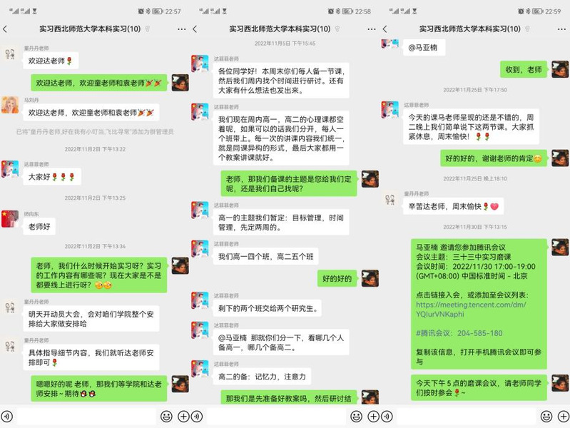 在实习中,我们感受到了作为一名教师的快乐和责任,同时也发现了自己的不足之处,克服了胆怯心理完成了职业生涯的第一课。单从备课过程就能发现,当好一名老师,教好一门课不是那么容易的。古之学者必有师。初入教学课堂的我们开启“教师”的新身份,可在教育这条路上我们是刚入门的学习者。为了我们能够以最好的状态和员工见面,也为了我们能有更快的进步,三十三中的达菲菲老师组织所有实习生每周开展一次教学研讨会,指导大家备课。每次会议结束,我都深深感受到来自一线教师的魅力所在,简单数句的点评,将备课过程中的欠缺之处逐一指出并给出建设性的意见,这是我初入职业生涯看到的光。