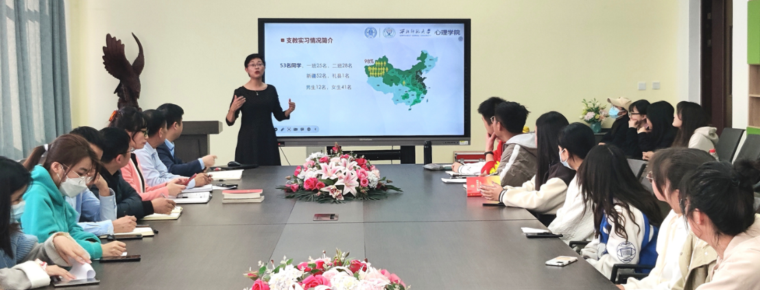 在会上,任德云主任介绍了支教实习的基本情况。此次前往新疆阿克苏、甘肃礼县等地支教实习的有53名同学,其中,应用心理一班25名,应用心理二班28名。前往新疆阿克苏支教实习的同学有52名,1名同学前往甘肃礼县支教实习。