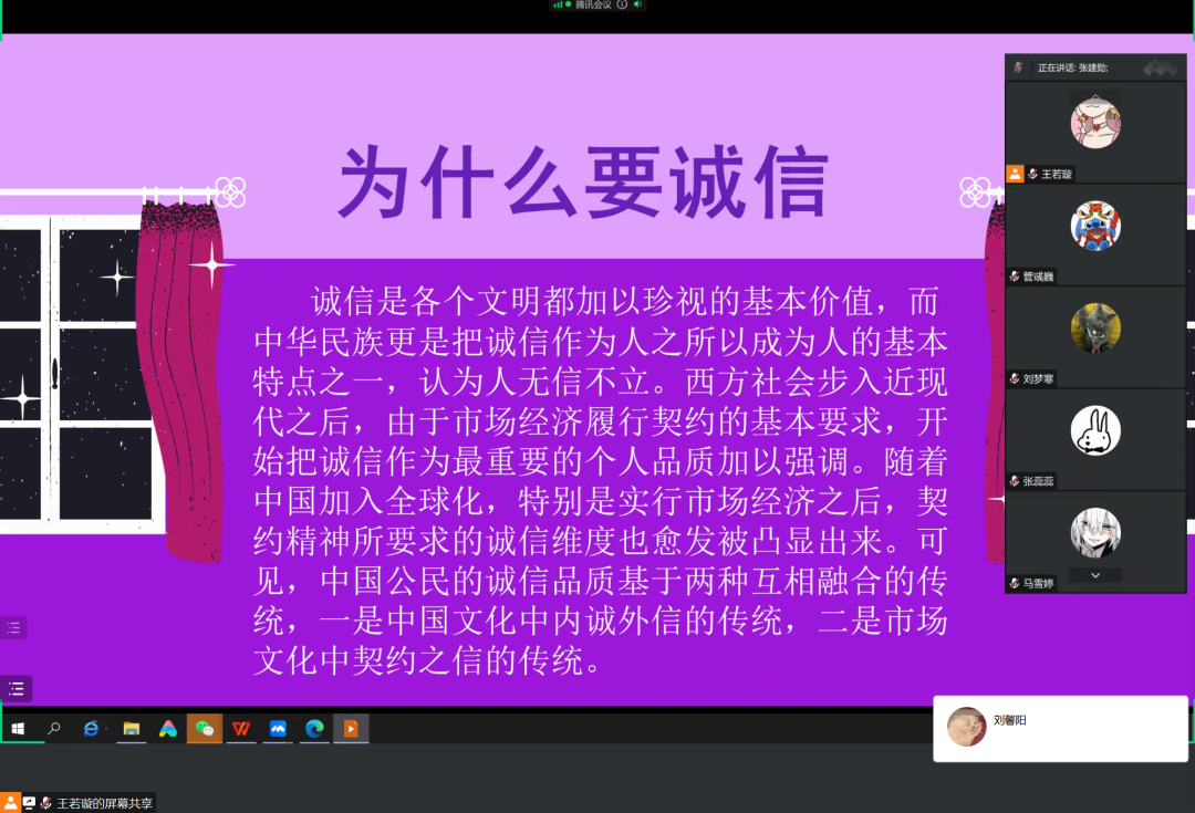 为进一步弘扬社会主义核心价值观,紧紧围绕立德树人根本任务,强化员工的诚信意识,提升诚信教育效果。班会的第二个内容是开展诚信教育主题系列活动,主要包括奖助诚信、实习就业、日常消费、学术诚信四个方面。