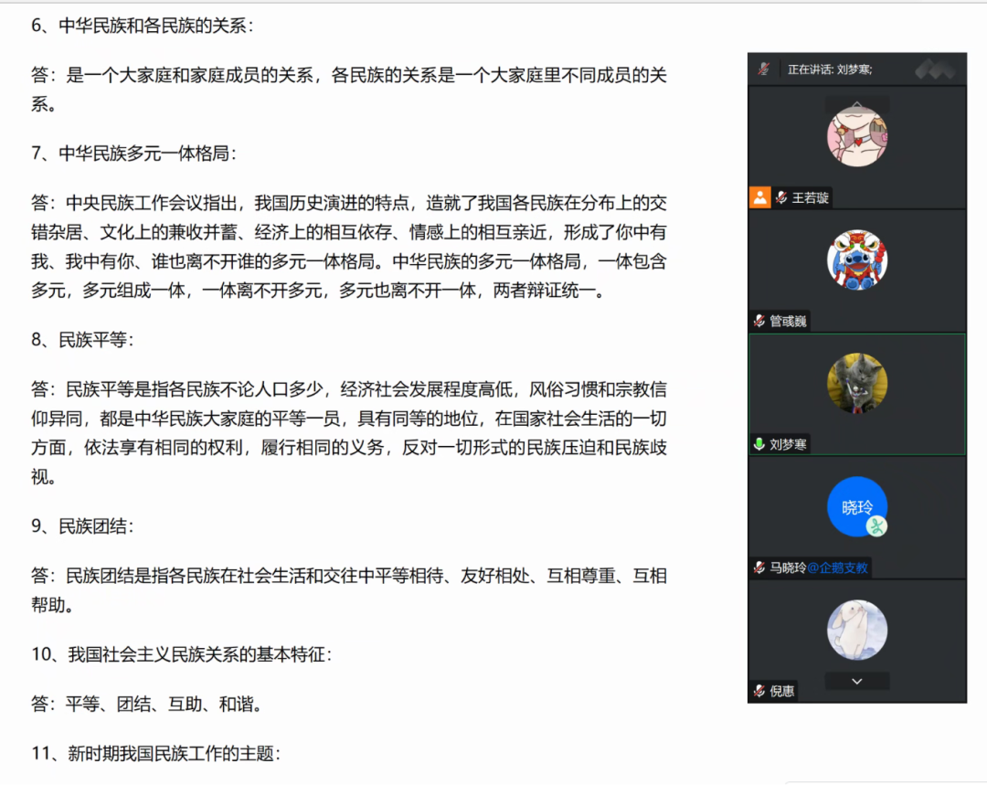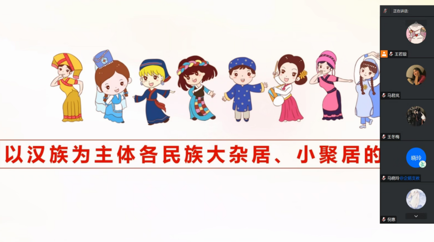 首先,张老师围绕民族团结进步主题展开介绍,着重强调了民族团结是社会主义民族关系的基本特征和核心内涵,通过讲述了国家对民族政策及法律法规、各民族风俗民情、党的民族理论、党和国家的民族政策的优越性等内容,丰富了同学们对于民族团结进步方面的相关知识,使同学们深刻认识到民族团结的重要性。