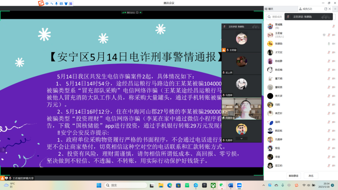 本次班会的最后一个主题是防范电信网络诈骗。随着社会的发展和信息技术的不断进步,犯罪分子电信网络诈骗手段也不断翻新,虚假链接诈骗、QQ诈骗、民族资产解冻诈骗、电信熟人借款诈骗、网络敲诈、“杀猪盘”诈骗等电信网络诈骗手段层出不穷,校园师生已成了诈骗犯罪的主要侵害群体。