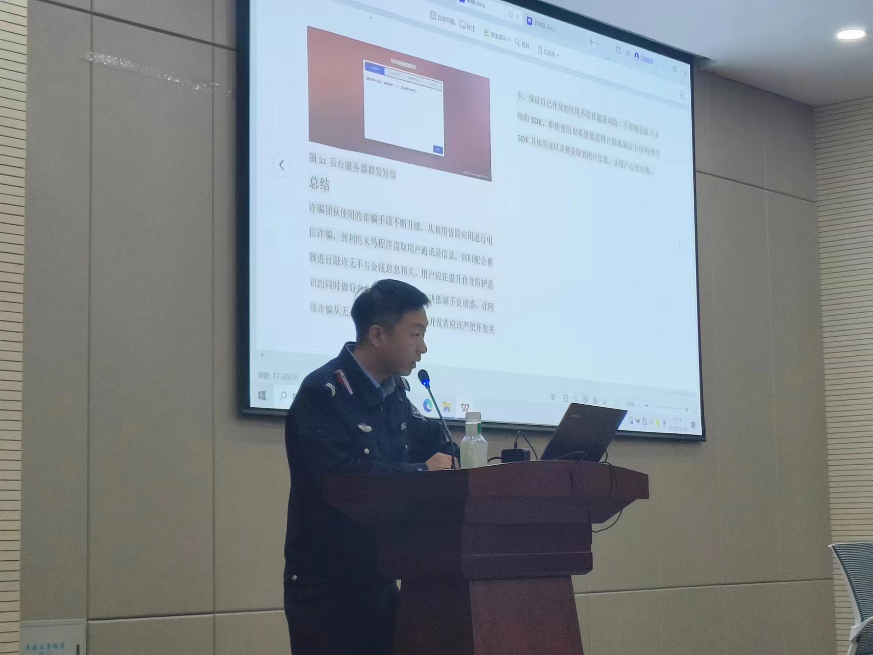 在此次反诈安全主题的教育活动中,何警官和郜警官带领大家认识了电信诈骗的类型和典型案例,向大家讲述了仿冒身份诈骗,“杀猪盘”刷单,网络赌博等诈骗手段的特点,揭露了在诈骗中常用的话术,教导老员工如何处理类似案件。何警官和郜警官还以典型案例为教育范本让我们意识到电信诈骗的狡猾危险,看到社会上被电诈伤害到的千千万万的家庭,更以此提高了我们的反诈意识和在网络生活中的警觉意识,谨防电信诈骗,保护好个人人身财产安全。