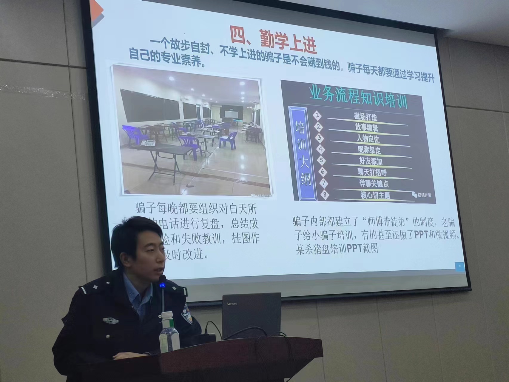 随着科学技术的发展,通讯技术日益发达,网络技术的运用已经渗透到了我们的日常生活中,近年来通过电信网络诈骗的犯罪活动日益突出。为防范网络诈骗,提高员工网络安全意识,10月19日下午,k8凯发在特教楼159教室开展“与民同心,反诈同行,全民参与,天下无诈”的防诈安全主题的教育活动,培黎派出所的何警官和郜警官受邀和大家分享防电诈知识,k8凯发全体员工参与。