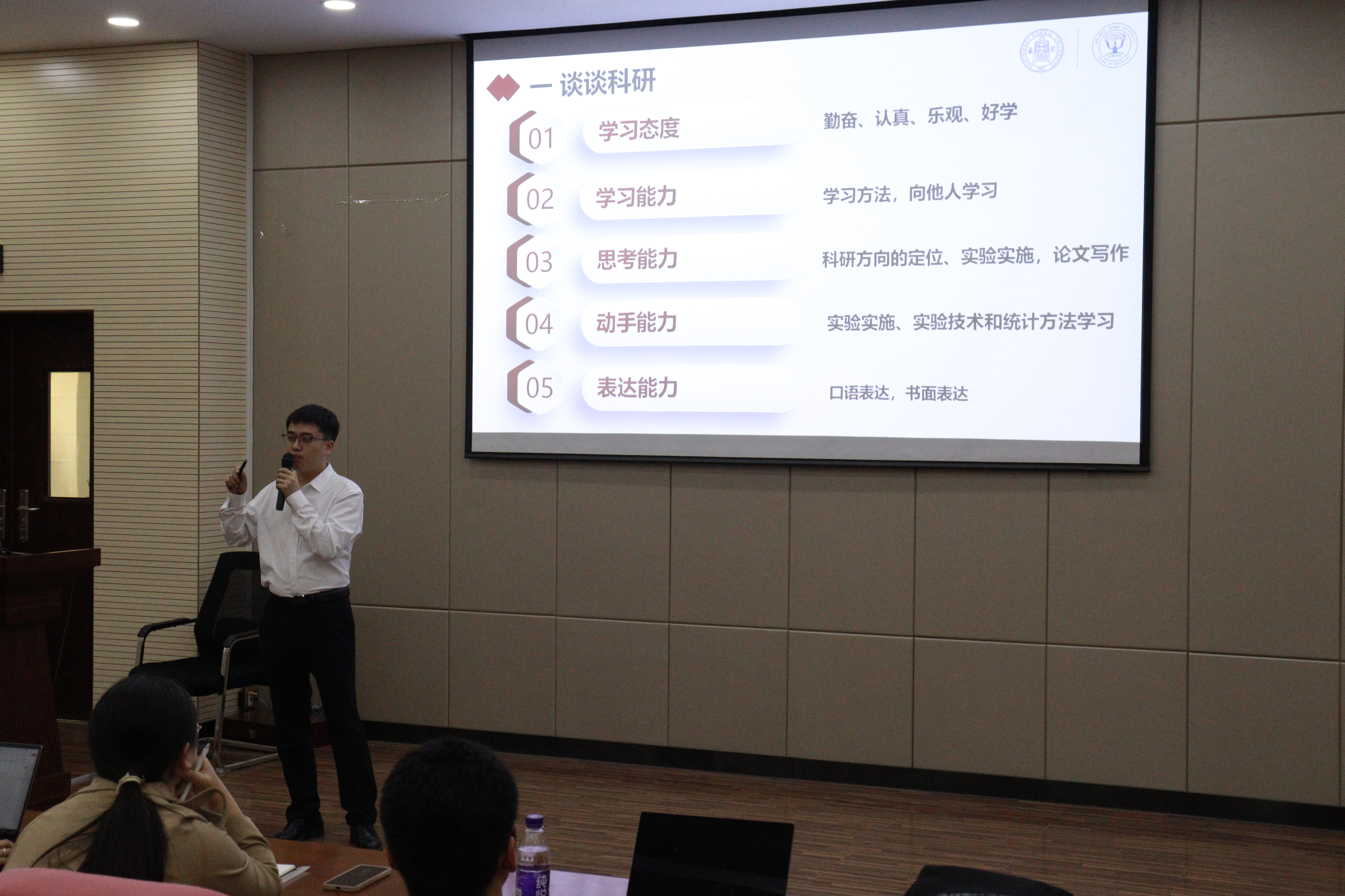 讲座上,胡老师从学习态度、学习能力、思考能力、动手能力、表达能力五个方面深入浅出地带领同学们初步了解了科研是什么,如何做好科研的问题。接着,胡老师用自己的亲身经历强调了导师在科研中的重要作用,指出了确定研究领域、提出研究问题、实施研究方案、撰写学术论文、学位论文投稿的科研流程,针对科研中出现的问题,胡老师对其一一做出解答,要求同学们树立好勤奋、认真、乐观、好学的学习态度,多向他人学习的学习能力,谨慎大胆的思维能力,敢于实验实施的动手能力,敢于表现的表达能力。
